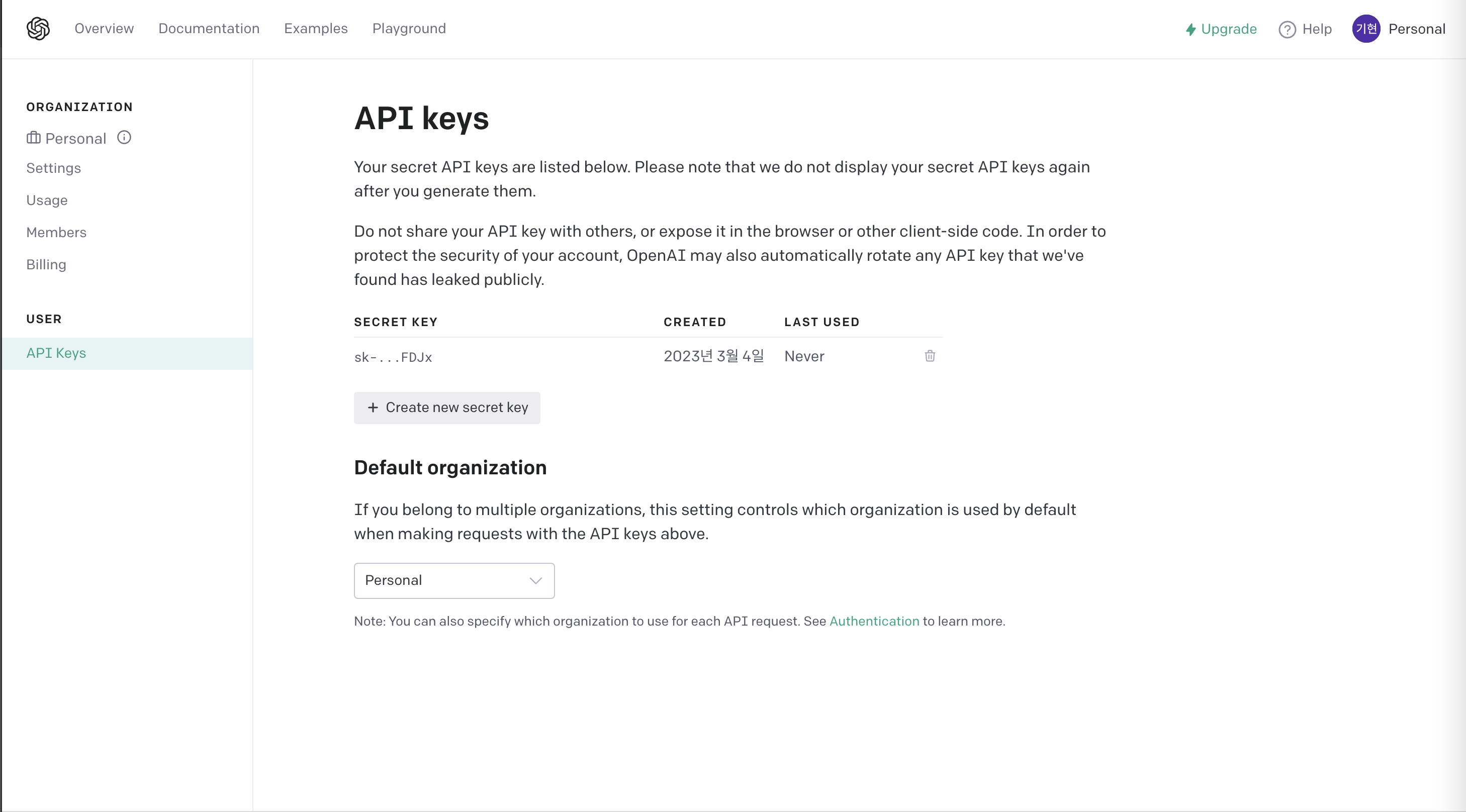 우선 위 사이트에서 자신만의 api key를 발급받자, 주의해야할 점은 처음에 한번만 key를 복사해올 수 있다는 점이다.