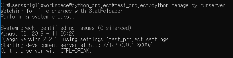 -> 포트번호를 지정하지 않으면 디폴트로 127.0.0.1 주소 및 8000번 포트를 사용