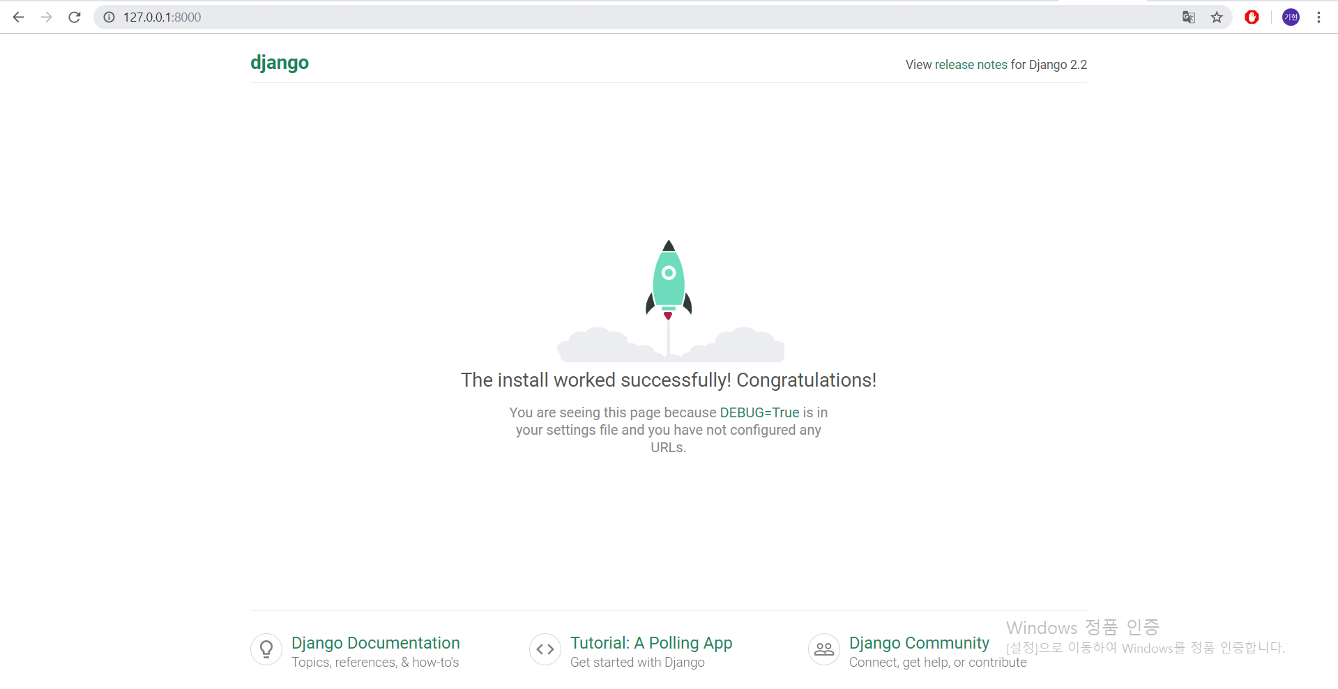 이제 주소창에 127.0.0.1:8000을 입력했을때 위와 같은 로켓이 나온다면 서버가 실행중인것입니다.