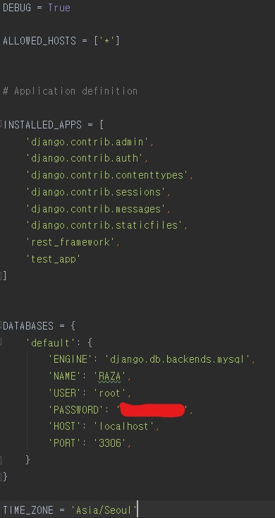 이어서 installed_apps에는 rest_framwork와 test_app이 추가 되었습니다. rest_framwork는 안드로이드와 REST 통신을 할때 이용될것이고 test_app은 위에서 우리가 만들어준 앱을 추가한것입니다.