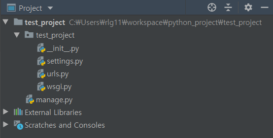 경로 안에 django-admin startproject <name> 명령어를 사용하여 장고 프로젝트를 생성한다
