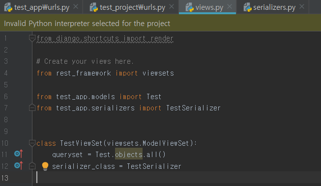 하위에는 queryset과 serializer_class가 있는데 queryset에는 Test.objects.all()를 입력해줍니다.