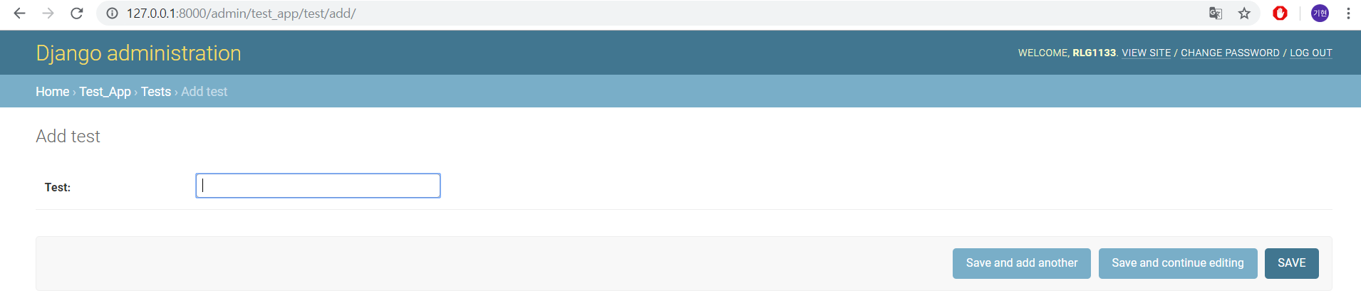간단한 테스트용이기 떄문에 Test라는 객체를 만들고 그안에 charfield의 test라는 필드를가진 필드하나짜리 테이블을 만들어줍니다.