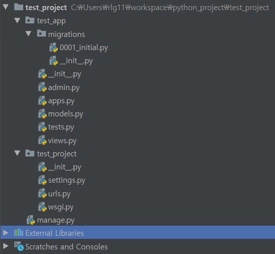 위와같은 과정을 거치면 migrations폴더에 test_app 0001.py 파일이 생길겁니다.