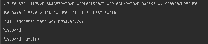python manage.py createsupersuer를 입력하고 이어지는 순서대로 이메일, 비밀번호 등을 입력하여 superuser를 만들어 줍니다.(비밀번호 형식에 주의해주세요)