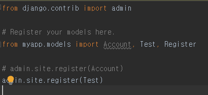 admin.site.register(Test)라는 코드를 넣어줘서 model.py안에 있는 Test클래스를 참조합니다.