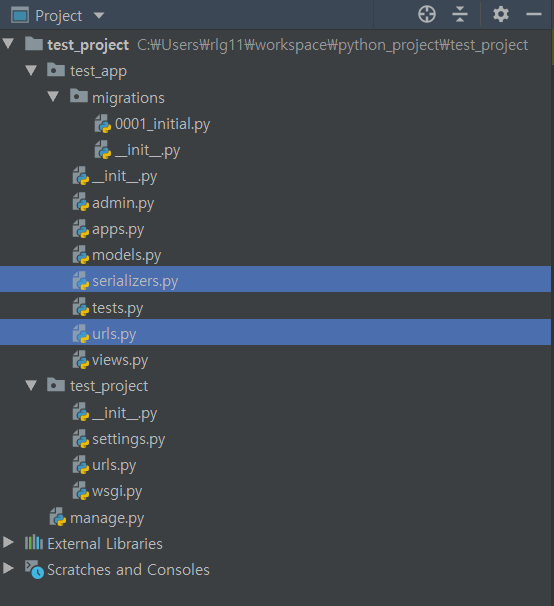 위와같이 우리가만들어준 TEST_APP 하위에 Tests라는 항목이 생긴것을 볼 수 있습니다.