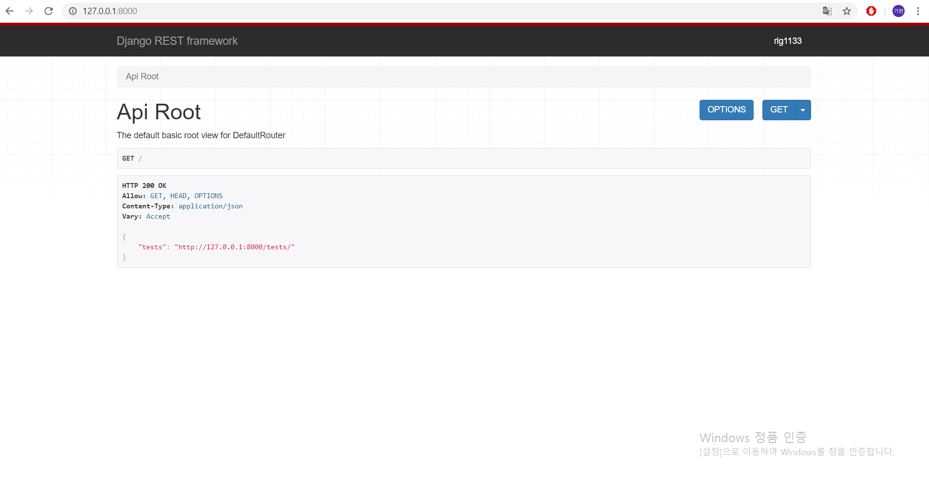 127.0.0.1:8000/tests 에서 127.0.0.1:8000/tests/?format=json 으로 바뀌면서 뭔가 익숙한 형태로 바뀌었습니다.