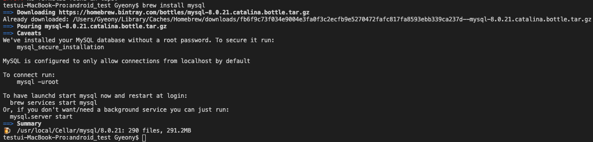 이후 mysql.server start 명령어로 mysql 서버를 실행하면 완료된다.