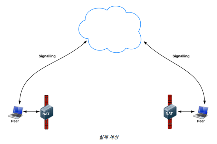 NAT들은 사설 로컬 네트워크에서 디바이스에 IP 주소를 제공하지만 이 주소는 외부에서 사용될 수 없습니다. 공용 주소가 없이는 WebRTC 피어(Peer)들은 통신할 수 있는 방법이 없습니다.