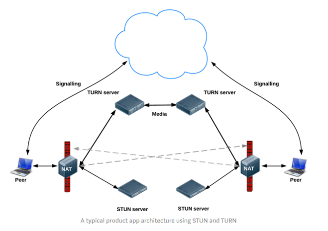 NAT가 UDP / TCP 오디오 / 비디오 스트림을 차단하지 않는 환경에서 WebRTC는 STUN 응답을 통해 NAT를 통해 통신 할 수 있습니다.